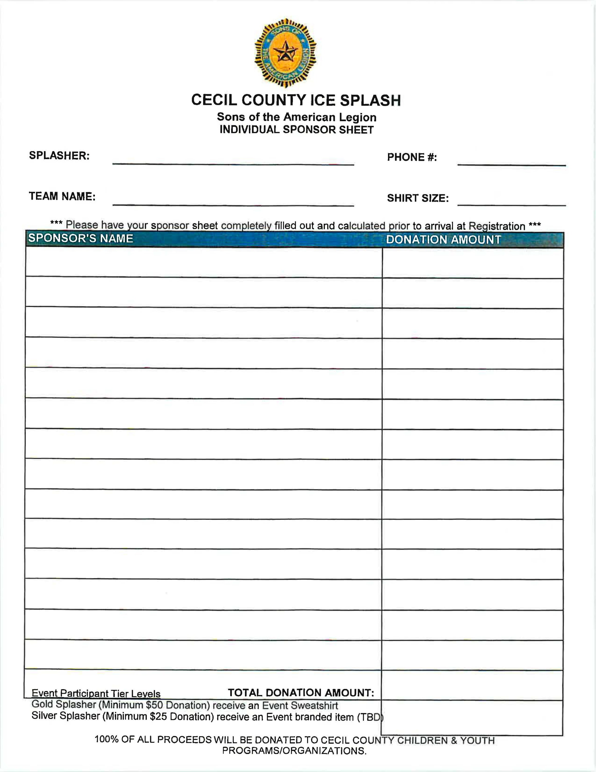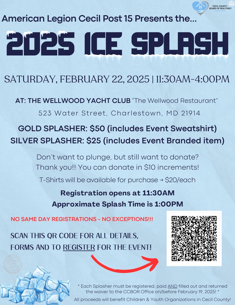 Sign up to be a Splasher! Gold Splasher (Minimum of $50 raised) or Silver Splasher (Minimum of $25 raised). If you plan to take the plunge you must complete your waiver form, and have it returned to CCBOR Office before 2/19/25. Sponsor Sheet is also available for a Splasher. All donations raised/sponsorships must be turned in to the CCBOR Office, along with the Sponsor Sheet by 2/19/25 as well. Please make sure any checks are written out to CCBOR. You CAN NOT sign up to splash the day of the event. Registration opens at 11:30am on 2/22/25 and the approximate splash time is 1:00 pm. This is a Rain or Shine Event. You can also click on each picture and print your form right from the event page or contact the board and we will provide you with the forms. If you do not wish to Splash, but would like to donate please continue to register but just click box to donate only. Donations can be accepted in $10 increments. 2025 Ice Splash T-Shirts are avaiable! If you would like to purchase a T-shirt, check the box with the size you wish to purchase.